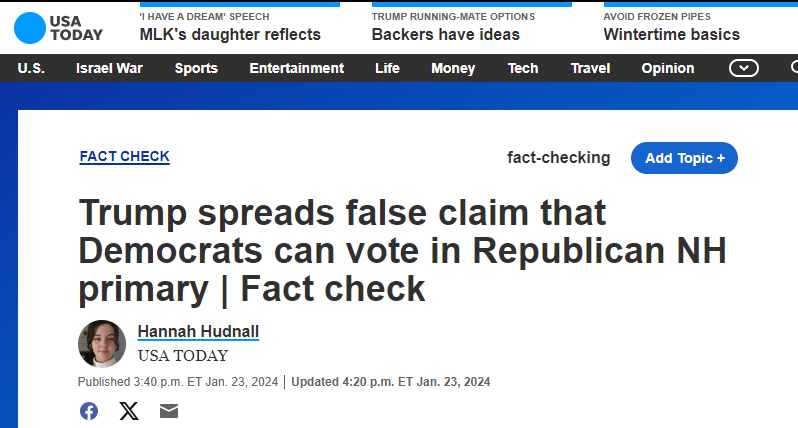 | Trump the Liar is Back This need to correct every little misstep by Trump and call it a lie goes back to his coming down the escalator in 2015. This evolved in the M5M fabulous list of 30,000 lies where Trump would be called a liar because he said there were 50-percent of something and it was really 49-percent. This buffoonery for 2024 has already begun with the narrative that Trump LIED about the fact that Democrats were voting in the Republican Primary in New Hampshire. He's called out because Democrats who change their affiliation to Independent or Republican can indeed vote in the Republican primary but they have to make the change in affiliation so technically they are not Democrats anymore, period. This is quite specious and misleading. If I am a real Democrat and I change my affiliation for a day to vote against Trump, I am still a real Democrat. I'm just playing the system. But, no matter, this makes Trump a liar because technically I was a Republican for a day. So here we go again with sketchy and biased phony “fact-checking.” |